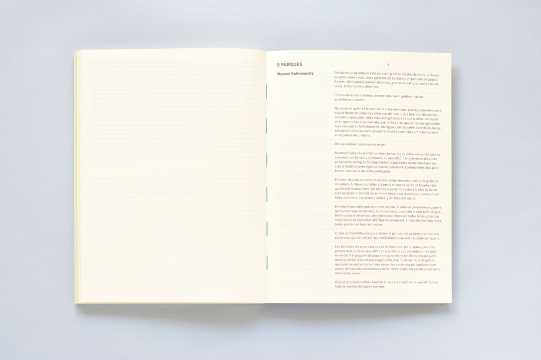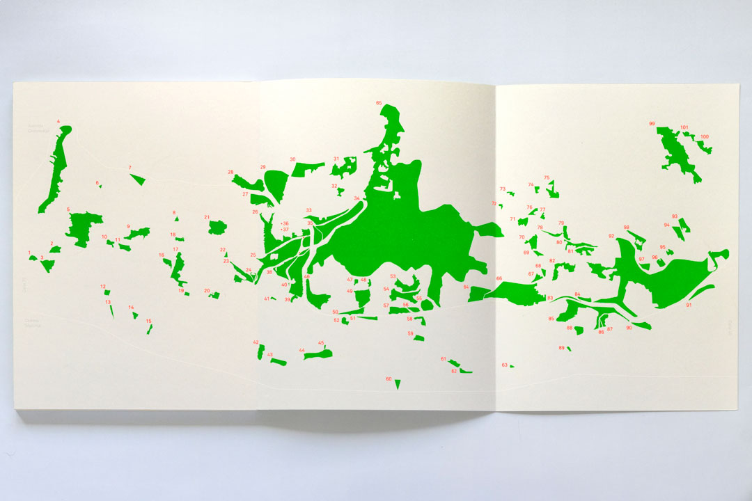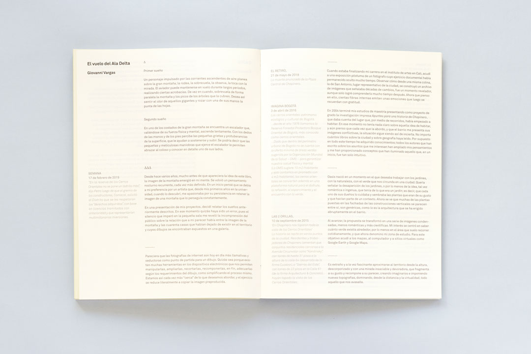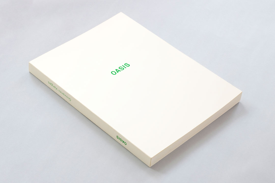 Este impreso, Oasis, hace parte de Apuntes para una historia de Chapinero, un proyecto extendido que se ha ido construyendo en diferentes etapas, y que ha adoptado diversas formas en respuesta a las transformaciones urbanas que ha atravesado el área que Giovanni Vargas, su autor, habita desde hace más de quince años, la zona conocida como Chapinero Alto en Bogotá (comprendida entre la carrera 7 y la avenida Circunvalar, y las calles 40 y 72). Oasis se compone de 100 figuras impresas que obedecen a un ejercicio de dibujo digital, y que han sido traducidas a un mecanismo análogo de impresión serigráfica, son representaciones abstractas de las zonas verdes del barrio (parques, lotes baldíos e intersecciones de paso). Algunas de estas han sobrevivido y otras han desaparecido durante el mapeo y la realización del impreso, un proceso que ha durado varios años.