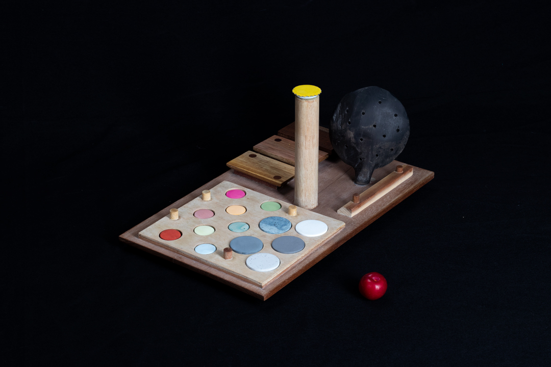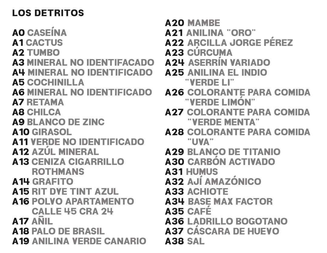 Los Detritos (The Detritus) is a proposal for new color calibration charts to be used on Martian Rovers. This proposal introduces new codes, tones and materials into the reference frames used to interpret martian conditions. Different samples from Colombia and other South American countries have been used to obtain the colors in these new charts. Samples include: Dust sweeped from the floor of an apartment in Bogotá, ashes picked up from Colombian cigarettes, spices used for cooking and pigments extracted from endemic plants of the Andes, amongst others. These calibration charts also carry some elements that help relate a human scale system in order to understand elements seen in mars. For example, a coin or a soda can is built into the structure of the charts in order to use as a reference and be able to understand, through comparison, the size of a martian rock that the Rover Camera is registering. These calibration charts constitute new reference frames based on South American contexts.