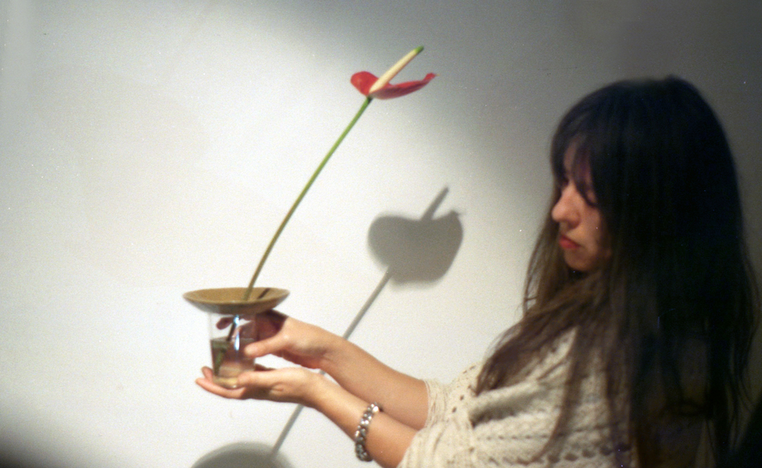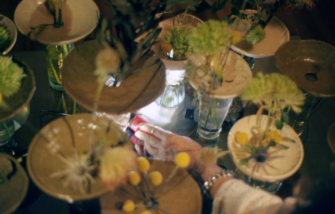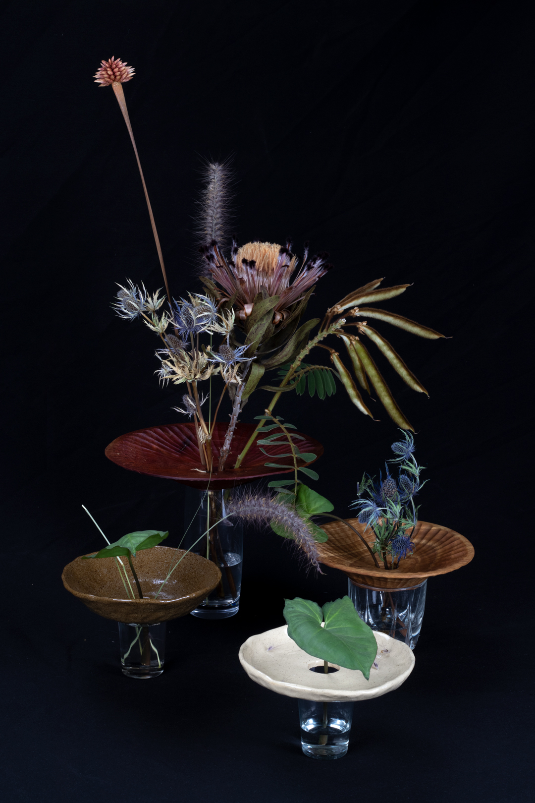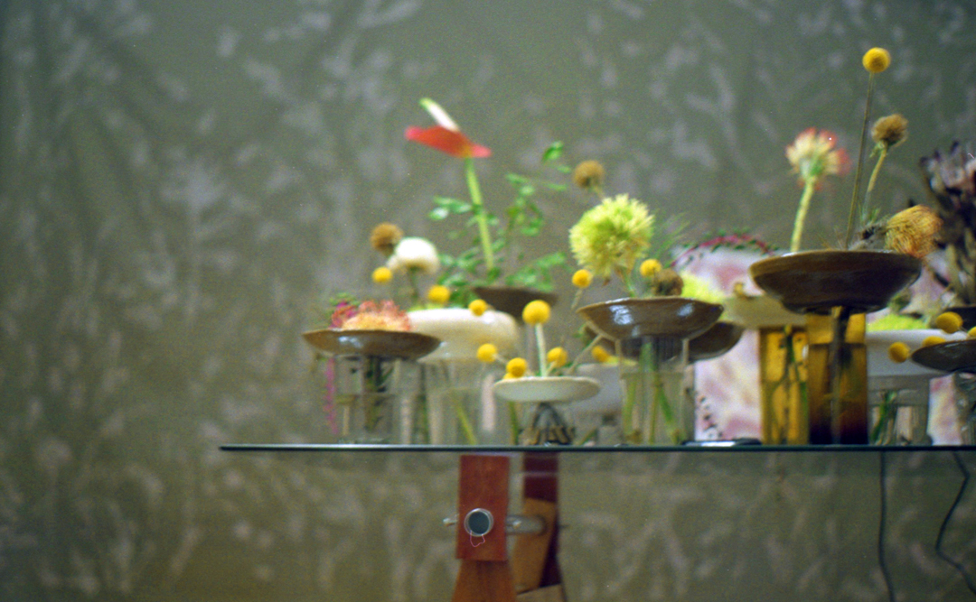 Un pantano con una serie de floreros en vidrio, madera y cerámica. Los vasos de los floreros son adquiridos en mercados o recolectados de colecciones rotas.